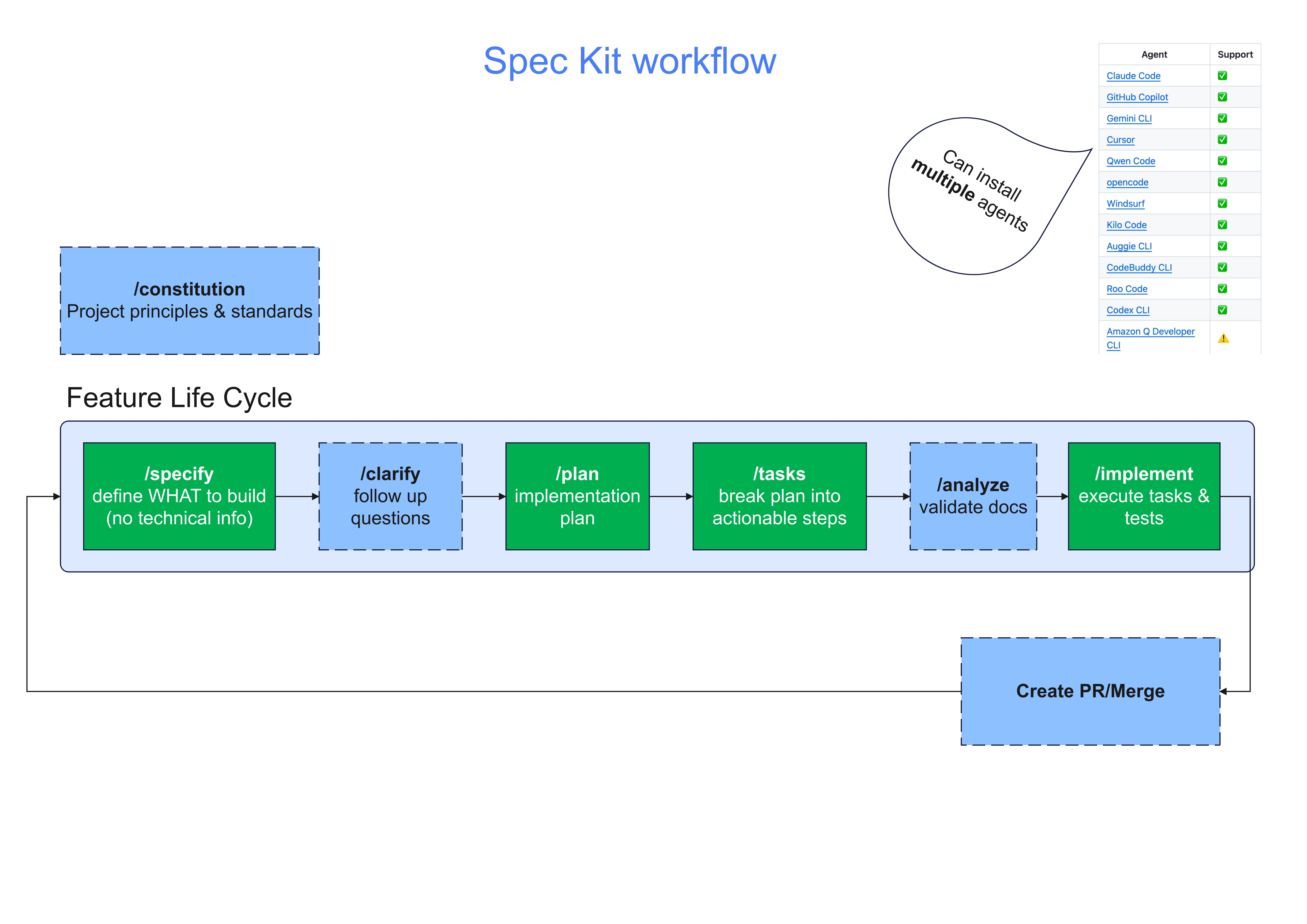 /constitution) and feature life cycles (/specify → /plan → /tasks → /implement) - Standardizes how teams reason, plan, and evolve codebases